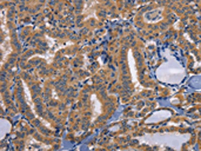 The image on the left is immunohistochemistry of paraffin-embedded Human thyroid cancer tissue using CSB-PA445679(CD47 Antibody) at dilution 1/50, on the right is treated with synthetic peptide. (Original magnification: ×200)