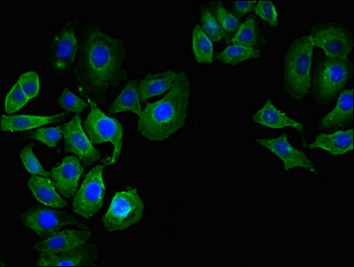 Immunofluorescent analysis of A549 cells using CSB-PA004945LA01HU at dilution of 1:100 and Alexa Fluor 488-congugated AffiniPure Goat Anti-Rabbit IgG(H+L)