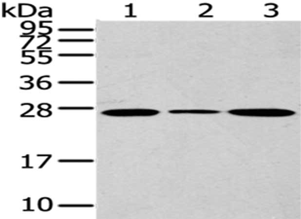 Gel: 12%SDS-PAGE,Lysate: 40 μg,Lane 1-3: NIH/3T3 cells, K562 cells, 293T cells,Primary antibody: CSB-PA259468(CD63 Antibody) at dilution 1/200 dilution,Secondary antibody: Goat anti rabbit IgG at 1/8000 dilution,Exposure time: 20 seconds