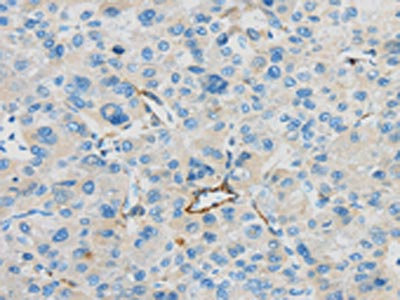 The image on the left is immunohistochemistry of paraffin-embedded Human liver cancer tissue using CSB-PA120615(CD63 Antibody) at dilution 1/35, on the right is treated with synthetic peptide. (Original magnification: ×200)