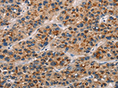 The image on the left is immunohistochemistry of paraffin-embedded Human liver cancer tissue using CSB-PA130815(CD80 Antibody) at dilution 1/25, on the right is treated with synthetic peptide. (Original magnification: ×200)