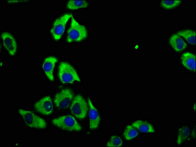 Immunofluorescence staining of A549 cells with CSB-PA13269A0Rb at 1:100, counter-stained with DAPI. The cells were fixed in 4% formaldehyde, permeabilized using 0.2% Triton X-100 and blocked in 10% normal Goat Serum. The cells were then incubated with the antibody overnight at 4°C. The secondary antibody was Alexa Fluor 488-congugated AffiniPure Goat Anti-Rabbit IgG(H+L).