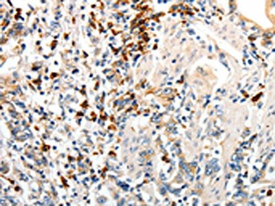 The image on the left is immunohistochemistry of paraffin-embedded Human gastric cancer tissue using CSB-PA748239(CD93 Antibody) at dilution 1/60, on the right is treated with synthetic peptide. (Original magnification: ×200)