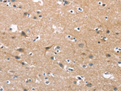 The image on the left is immunohistochemistry of paraffin-embedded Human brain tissue using CSB-PA786395(CDC25B Antibody) at dilution 1/45, on the right is treated with synthetic peptide. (Original magnification: ×200)