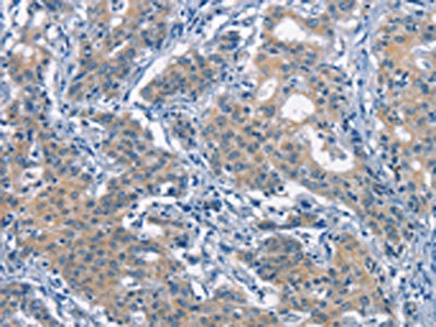 The image on the left is immunohistochemistry of paraffin-embedded Human gastric cancer tissue using CSB-PA169739(CDC25B Antibody) at dilution 1/50, on the right is treated with synthetic peptide. (Original magnification: ×200)