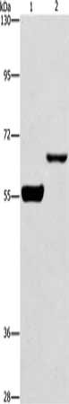 Gel: 6%SDS-PAGE, Lysate: 40 μg, Lane 1-2: Mouse brain tissue, RAW264.7 cells, Primary antibody: CSB-PA169739(CDC25B Antibody) at dilution 1/250, Secondary antibody: Goat anti rabbit IgG at 1/8000 dilution, Exposure time: 20 seconds