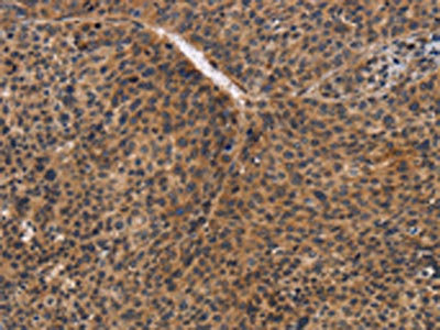 The image on the left is immunohistochemistry of paraffin-embedded Human liver cancer tissue using CSB-PA037967(CDC34 Antibody) at dilution 1/50, on the right is treated with synthetic peptide. (Original magnification: ×200)
