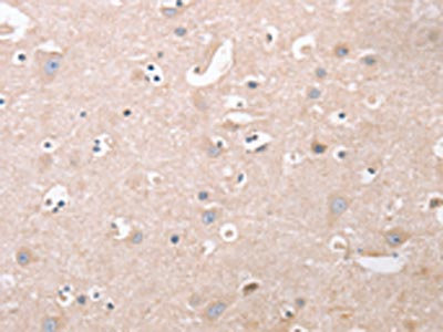 The image on the left is immunohistochemistry of paraffin-embedded Human brain tissue using CSB-PA497239(CDCA4 Antibody) at dilution 1/50, on the right is treated with synthetic peptide. (Original magnification: ×200)