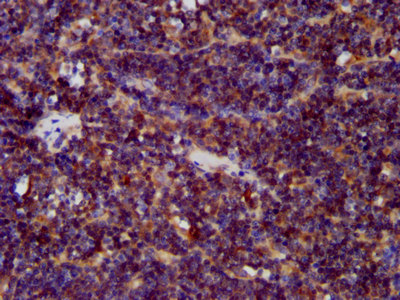 IHC image of CSB-PA850301LA01HU diluted at 1:400 and staining in paraffin-embedded human lymph node tissue performed on a Leica BondTM system. After dewaxing and hydration, antigen retrieval was mediated by high pressure in a citrate buffer (pH 6.0). Section was blocked with 10% normal goat serum 30min at RT. Then primary antibody (1% BSA) was incubated at 4°C overnight. The primary is detected by a biotinylated secondary antibody and visualized using an HRP conjugated SP system.