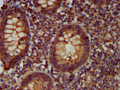 IHC image of CSB-PA850301LA01HU diluted at 1:400 and staining in paraffin-embedded human appendix tissue performed on a Leica BondTM system. After dewaxing and hydration, antigen retrieval was mediated by high pressure in a citrate buffer (pH 6.0). Section was blocked with 10% normal goat serum 30min at RT. Then primary antibody (1% BSA) was incubated at 4°C overnight. The primary is detected by a biotinylated secondary antibody and visualized using an HRP conjugated SP system.