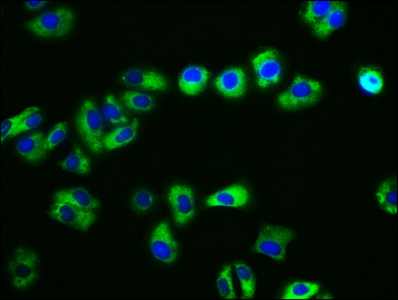 Immunofluorescence staining of HepG2 cells with CSB-PA005040LA01HU at 1:133, counter-stained with DAPI. The cells were fixed in 4% formaldehyde, permeabilized using 0.2% Triton X-100 and blocked in 10% normal Goat Serum. The cells were then incubated with the antibody overnight at 4°C. The secondary antibody was Alexa Fluor 488-congugated AffiniPure Goat Anti-Rabbit IgG(H+L).