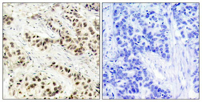 Immunohistochemical analysis of paraffin-embedded human breast carcinoma tissue using CDC2(Ab-15) Antibody(left) or the same antibody preincubated with blocking peptide(right).