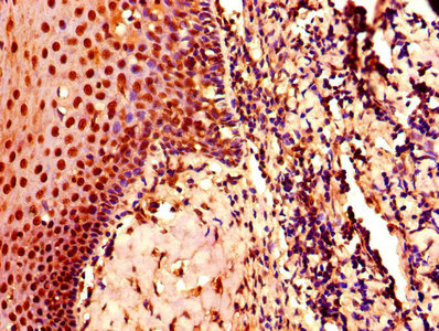 IHC image of CSB-PA005061LA01HU diluted at 1:800 and staining in paraffin-embedded human tonsil tissue performed on a Leica BondTM system. After dewaxing and hydration, antigen retrieval was mediated by high pressure in a citrate buffer (pH 6.0). Section was blocked with 10% normal goat serum 30min at RT. Then primary antibody (1% BSA) was incubated at 4°C overnight. The primary is detected by a biotinylated secondary antibody and visualized using an HRP conjugated SP system.
