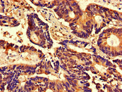 IHC image of CSB-PA005061LA01HU diluted at 1:800 and staining in paraffin-embedded human colon cancer performed on a Leica BondTM system. After dewaxing and hydration, antigen retrieval was mediated by high pressure in a citrate buffer (pH 6.0). Section was blocked with 10% normal goat serum 30min at RT. Then primary antibody (1% BSA) was incubated at 4°C overnight. The primary is detected by a biotinylated secondary antibody and visualized using an HRP conjugated SP system.
