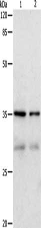 Gel: 12%SDS-PAGE, Lysate: 30 μg, Lane 1-2: Hela cells, 293T cells, Primary antibody: CSB-PA597701(CDK4 Antibody) at dilution 1/450, Secondary antibody: Goat anti rabbit IgG at 1/8000 dilution, Exposure time: 1 minute