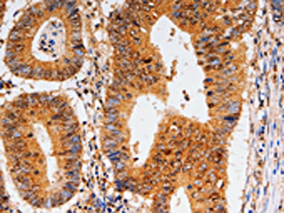 The image on the left is immunohistochemistry of paraffin-embedded Human colon cancer tissue using CSB-PA871419(CDK6 Antibody) at dilution 1/10, on the right is treated with fusion protein. (Original magnification: ×200)