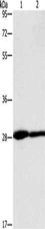 Gel: 10%SDS-PAGE, Lysate: 40 μg, Lane 1-2: Human fetal brain tissue, A431 cells, Primary antibody: CSB-PA260295(CEACAM3 Antibody) at dilution 1/400, Secondary antibody: Goat anti rabbit IgG at 1/8000 dilution, Exposure time: 1 minute