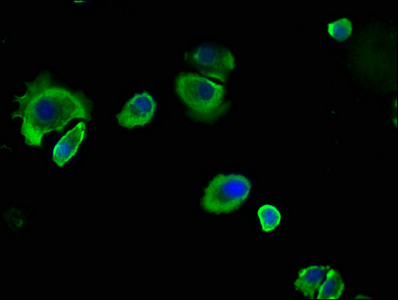 Immunofluorescence staining of MCF-7 cells with CSB-PA005165LA01HU at 1:133, counter-stained with DAPI. The cells were fixed in 4% formaldehyde, permeabilized using 0.2% Triton X-100 and blocked in 10% normal Goat Serum. The cells were then incubated with the antibody overnight at 4°C. The secondary antibody was Alexa Fluor 488-congugated AffiniPure Goat Anti-Rabbit IgG(H+L).