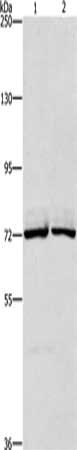 Gel: 6%SDS-PAGE, Lysate: 40 μg, Lane 1-2: Hela cells, hepG2 cells, Primary antibody: CSB-PA194515(CEL Antibody) at dilution 1/550, Secondary antibody: Goat anti rabbit IgG at 1/8000 dilution, Exposure time: 3 minutes