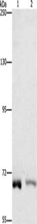 Gel: 6%SDS-PAGE, Lysate: 40 μg, Lane 1-2: K562 cells, A431 cells, Primary antibody: CSB-PA722114(CENPE Antibody) at dilution 1/1400, Secondary antibody: Goat anti rabbit IgG at 1/8000 dilution, Exposure time: 1 minute