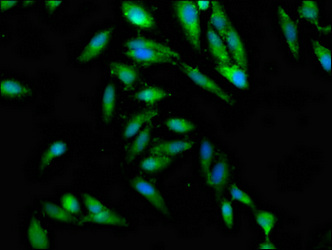 Immunofluorescence staining of Hela cells with CSB-PA808994LA01HU at 1:100, counter-stained with DAPI. The cells were fixed in 4% formaldehyde, permeabilized using 0.2% Triton X-100 and blocked in 10% normal Goat Serum. The cells were then incubated with the antibody overnight at 4°C. The secondary antibody was Alexa Fluor 488-congugated AffiniPure Goat Anti-Rabbit IgG(H+L).