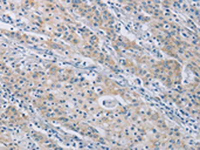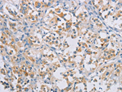 The image on the left is immunohistochemistry of paraffin-embedded Human gastric cancer tissue using CSB-PA083613(CERKL Antibody) at dilution 1/50, on the right is treated with synthetic peptide. (Original magnification: ×200)