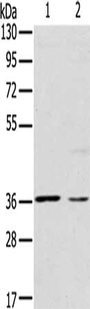 Gel: 8%SDS-PAGE, Lysate: 40 μg, Lane 1-2: Hepg2 cells, hela cells, Primary antibody: CSB-PA877434(CERS1 Antibody) at dilution 1/200, Secondary antibody: Goat anti rabbit IgG at 1/8000 dilution, Exposure time: 20 seconds