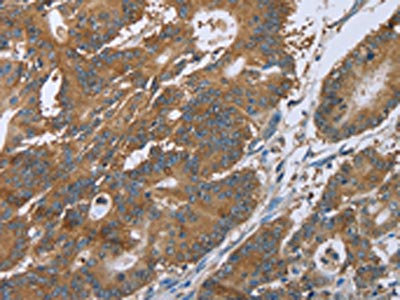 The image on the left is immunohistochemistry of paraffin-embedded Human colon cancer tissue using CSB-PA054139(CERS4 Antibody) at dilution 1/35, on the right is treated with synthetic peptide. (Original magnification: ×200)