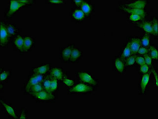 Immunofluorescent analysis of HepG2 cells using CSB-PA005258LA01HU at dilution of 1:100 and Alexa Fluor 488-congugated AffiniPure Goat Anti-Rabbit IgG(H+L)