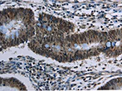 The image on the left is immunohistochemistry of paraffin-embedded Human colon cancer tissue using CSB-PA105996(CFLAR Antibody) at dilution 1/20, on the right is treated with synthetic peptide. (Original magnification: ×200)