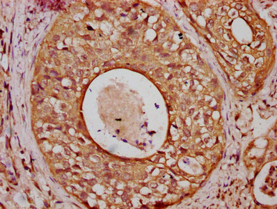 IHC image of CSB-PA005302LA01HU diluted at 1:800 and staining in paraffin-embedded human cervical cancer performed on a Leica BondTM system. After dewaxing and hydration, antigen retrieval was mediated by high pressure in a citrate buffer (pH 6.0). Section was blocked with 10% normal goat serum 30min at RT. Then primary antibody (1% BSA) was incubated at 4°C overnight. The primary is detected by a biotinylated secondary antibody and visualized using an HRP conjugated SP system.