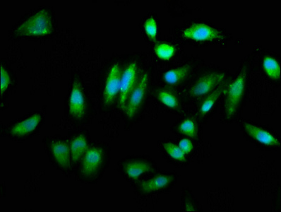 Immunofluorescence staining of Hela cells with CSB-PA883606LA01HU at 1:260, counter-stained with DAPI. The cells were fixed in 4% formaldehyde, permeabilized using 0.2% Triton X-100 and blocked in 10% normal Goat Serum. The cells were then incubated with the antibody overnight at 4°C. The secondary antibody was Alexa Fluor 488-congugated AffiniPure Goat Anti-Rabbit IgG(H+L).