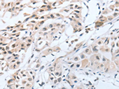 The image on the left is immunohistochemistry of paraffin-embedded Human lung cancer tissue using CSB-PA968134(CHRNA10 Antibody) at dilution 1/50, on the right is treated with synthetic peptide. (Original magnification: ×200)