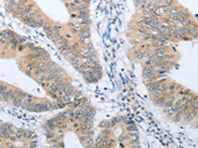 The image on the left is immunohistochemistry of paraffin-embedded Human colon cancer tissue using CSB-PA968134(CHRNA10 Antibody) at dilution 1/50, on the right is treated with synthetic peptide. (Original magnification: ×200)