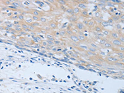 The image on the left is immunohistochemistry of paraffin-embedded Human cervical cancer tissue using CSB-PA969473(CHRFAM7A Antibody) at dilution 1/40, on the right is treated with synthetic peptide. (Original magnification: ×200)