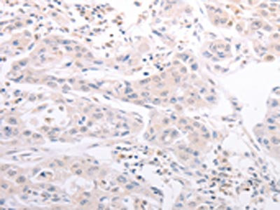 The image on the left is immunohistochemistry of paraffin-embedded Human lung cancer tissue using CSB-PA552167(CIDEB Antibody) at dilution 1/50, on the right is treated with fusion protein. (Original magnification: ×200)