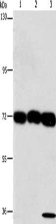 Gel: 6%SDS-PAGE, Lysate: 40 μg, Lane 1-3: 293T cells, hepG2 cells, A549 cells, Primary antibody: CSB-PA133590(CKAP4 Antibody) at dilution 1/1250, Secondary antibody: Goat anti rabbit IgG at 1/8000 dilution, Exposure time: 30 seconds