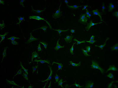 Immunofluorescence staining of U251 cells with CSB-PA005485LA01HU at 1:100, counter-stained with DAPI. The cells were fixed in 4% formaldehyde and blocked in 10% normal Goat Serum. The cells were then incubated with the antibody overnight at 4°C. The secondary antibody was Alexa Fluor 488-congugated AffiniPure Goat Anti-Rabbit IgG(H+L).
