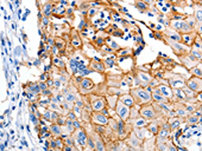 The image on the left is immunohistochemistry of paraffin-embedded Human cervical cancer tissue using CSB-PA983237(CLDN1 Antibody) at dilution 1/150, on the right is treated with synthetic peptide. (Original magnification: ×200)