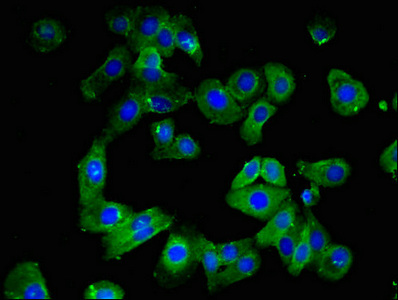 Immunofluorescent analysis of HepG2 cells using CSB-PA005491LA01HU at dilution of 1:100 and Alexa Fluor 488-congugated AffiniPure Goat Anti-Rabbit IgG(H+L)