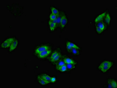 Immunofluorescent analysis of HepG2 cells using CSB-PA005510ESR1HU at dilution of 1:100 and Alexa Fluor 488-congugated AffiniPure Goat Anti-Rabbit IgG(H+L)