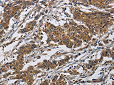 The image on the left is immunohistochemistry of paraffin-embedded Human gastric cancer tissue using CSB-PA982170(CLDN8 Antibody) at dilution 1/50, on the right is treated with synthetic peptide. (Original magnification: ×200)