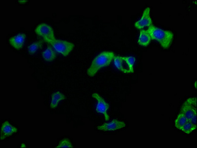 Immunofluorescence staining of HepG2 cells with CSB-PA811601LA01HU at 1:50, counter-stained with DAPI. The cells were fixed in 4% formaldehyde, permeabilized using 0.2% Triton X-100 and blocked in 10% normal Goat Serum. The cells were then incubated with the antibody overnight at 4°C. The secondary antibody was Alexa Fluor 488-congugated AffiniPure Goat Anti-Rabbit IgG(H+L).