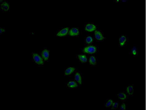 Immunofluorescence staining of Hela cells with CSB-PA725176ESR2HU at 1:100, counter-stained with DAPI. The cells were fixed in 4% formaldehyde, permeabilized using 0.2% Triton X-100 and blocked in 10% normal Goat Serum. The cells were then incubated with the antibody overnight at 4°C. The secondary antibody was Alexa Fluor 488-congugated AffiniPure Goat Anti-Rabbit IgG(H+L).