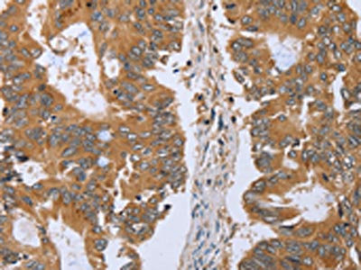 The image on the left is immunohistochemistry of paraffin-embedded Human colon cancer tissue using CSB-PA288812(CLEC16A Antibody) at dilution 1/45, on the right is treated with synthetic peptide. (Original magnification: ×200)