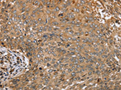 The image on the left is immunohistochemistry of paraffin-embedded Human cervical cancer tissue using CSB-PA288812(CLEC16A Antibody) at dilution 1/45, on the right is treated with synthetic peptide. (Original magnification: ×200)