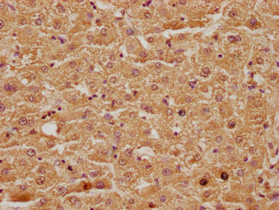 IHC image of CSB-PA744269LA01HU diluted at 1:100 and staining in paraffin-embedded human liver tissue performed on a Leica BondTM system. After dewaxing and hydration, antigen retrieval was mediated by high pressure in a citrate buffer (pH 6.0). Section was blocked with 10% normal goat serum 30min at RT. Then primary antibody (1% BSA) was incubated at 4°C overnight. The primary is detected by a biotinylated secondary antibody and visualized using an HRP conjugated SP system.