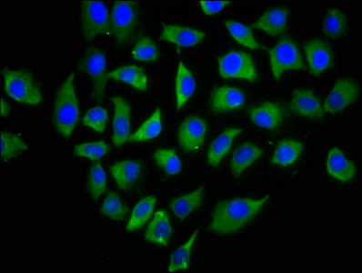 Immunofluorescence staining of A549 cells with CSB-PA862003LA01HU at 1:166, counter-stained with DAPI. The cells were fixed in 4% formaldehyde, permeabilized using 0.2% Triton X-100 and blocked in 10% normal Goat Serum. The cells were then incubated with the antibody overnight at 4°C. The secondary antibody was Alexa Fluor 488-congugated AffiniPure Goat Anti-Rabbit IgG(H+L).