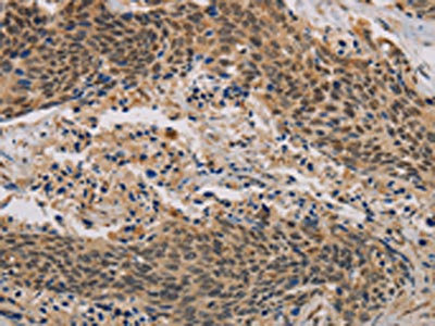The image on the left is immunohistochemistry of paraffin-embedded Human cervical cancer tissue using CSB-PA163406(CLEC5A Antibody) at dilution 1/20, on the right is treated with synthetic peptide. (Original magnification: ×200)
