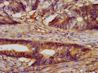 IHC image of CSB-PA005567LA01HU diluted at 1:300 and staining in paraffin-embedded human colon cancer performed on a Leica BondTM system. After dewaxing and hydration, antigen retrieval was mediated by high pressure in a citrate buffer (pH 6.0). Section was blocked with 10% normal goat serum 30min at RT. Then primary antibody (1% BSA) was incubated at 4°C overnight. The primary is detected by a biotinylated secondary antibody and visualized using an HRP conjugated SP system.